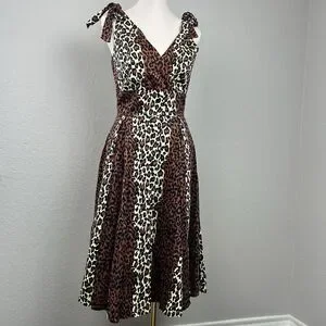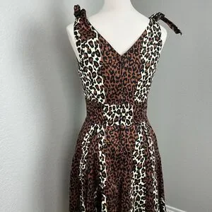 This is a Deadly Dames Women's Tie Me Up Dress in size M, featuring an animal print pattern, sleeveless style with a V-neckline and tie closure. The dress is made of 97% cotton and 3% spandex, with accents of animal print. It is a fit & flare style midi dress suitable for various occasions like Holy Communion, parties, casual, formal, or business events. Perfect for the seasons of summer, fall, and spring.