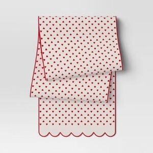 Elevate your table setup with the festive appeal of this Hearts Table Runner from Threshold™. The rectangular table runner is adorned with a red heart print on a white background, complemented by the solid red reverse and scalloped ends. The 100% cotton construction helps protect your table from accidental spills, and it can be machine washed for easy cleaning. Pair with coordinating napkins and placemats to create a seamless and chic dining setting.