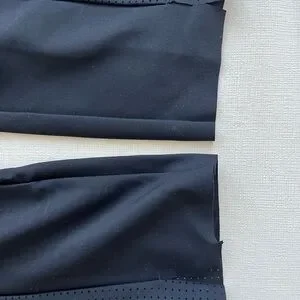 These sleek black leggings offer a comfortable fit with a high-waisted design, zippered pockets, perforated pant leg and small open slits at hem. Perfect for casual wear.