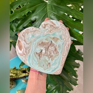 This stunning heart-shaped Blue Caribbean Calcite piece features calming shades of oceanic blue and earthy white, reminiscent of serene coastal waters. A relatively rare crystal, Blue Caribbean Calcite is a unique combination of calcite and aragonite, known for its soothing, transformative energy.