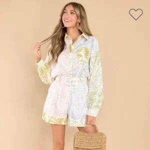 New with tags Aura Linen Blend 55% Linen 45% Rayon Long Sleeve Button down blouse with matching High waisted shorts * Please Note * Belt is Missing. Women’s size medium. Zimmerman dupe.