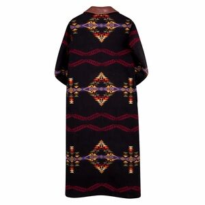 This Pendleton Rimrock jacquard coat features the brand’s iconic stepped arrow pattern, woven in rich, multicolor Southwestern-inspired motifs. Crafted from Pendleton’s signature wool jacquard, this longline coat offers warmth, structure, and timeless Western style.