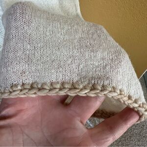 Ivory sheer knit sweater. Tunic or mini-dress length. Open weave abstract geometric design body. Braided natural trim accents at scoop neckline and cuffs. Gathered tiered ruffle hem - by Free People!