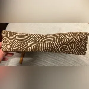 Brown & tan swirly graffiti pattern on exterior, beautiful pink interior fabric.