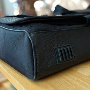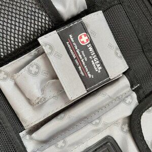 Swiss Gear Mythos 17" casual computer case. Zip out mesh pocket for water bottle. Trolley strap to secure to another wheeled case. File compartment, organizer and zippered pocket. About 13" H x 16.5" W x 4" deep. Holds up to 17" computer. Polyvinyl