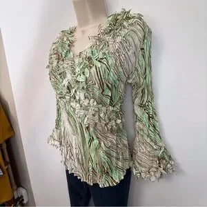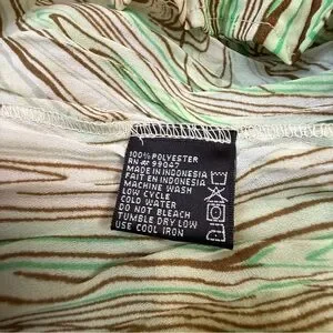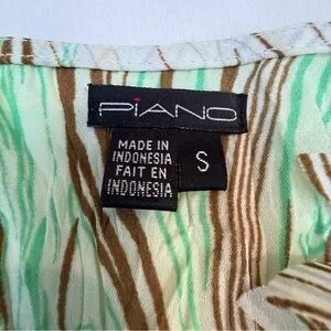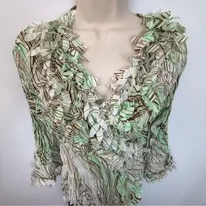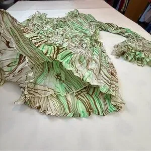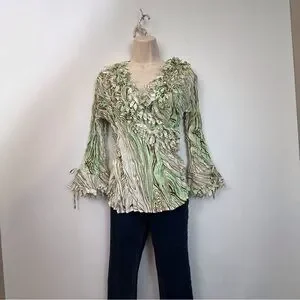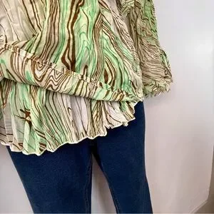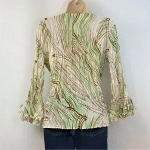 Piano Green Brown White Swirl Print Blouse Crinkle Fabric, Faux wrap front
