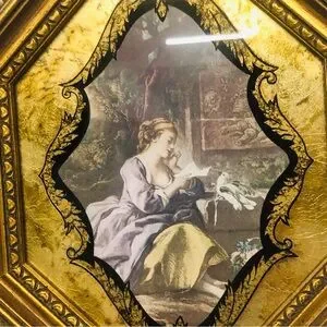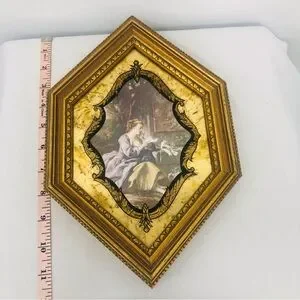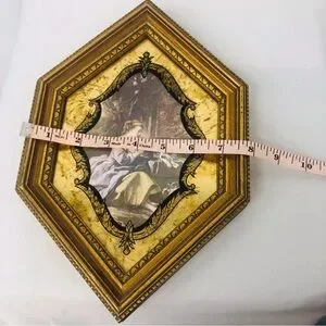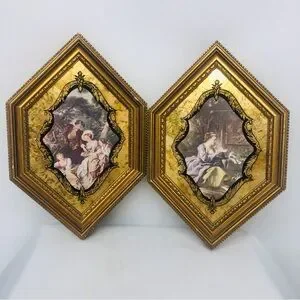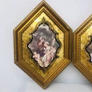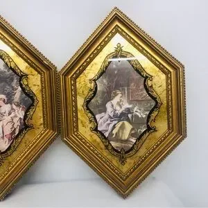 Pair of Vintage Gold Hexagon Wood Framed Victorian Prints