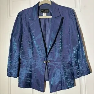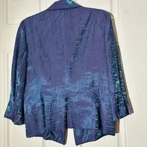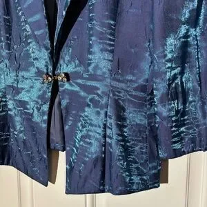 This pretty jacket was originally a two piece which included a cami. The jacket can be worn alone over a dress or evening pants. It is a pretty almost violet blue color. Fabric which is 75% rayon and 25% polyester appears to be a crushed satin with a solid collar and lapel. As can be seen, there is a crystal broach for fastening. Measurements are length from top of collar 25”, sleeves from top 19” and pit to pit 19”.