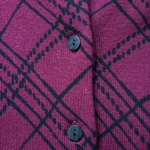 This is a classic button down cardigan. It is burgundy and black. Fabric content is 57” cotton, 26% viscose and 17” nylon. Sweater could be machine washed and dried. Measurements are length 25”, sleeves from top of shoulders 38” and pit to pit 21”. Just noting that the sweater color is the first picture.