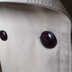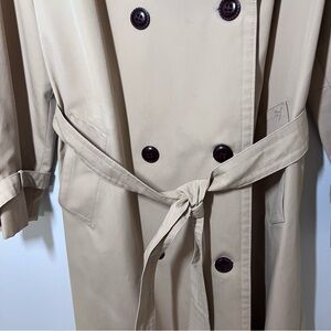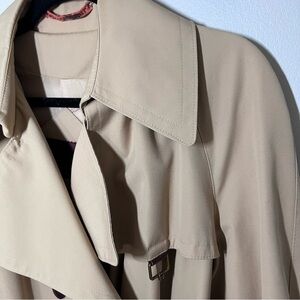 Etienne Aigner Vintage Womens Trench Coat Rain Jacket Double Breasted Belted 16. This is a vintage size 16 so please see measurements before ordering! This jacket is in good condition for its age, although it does have a few spots, shown in photos, so it probably needs to be dry cleaned. It has 3 buttons up the front, the waist is belted, and the wrists are belted. Huge collar, as you’d expect. Slit up the back. Beautiful trench coat. This is a family piece for me- my mom has owned this for as long as I can remember and I was born in the early 80s.