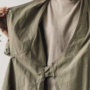 A lightweight long coat in a dusty green Japanese cotton ripstop fabric with a kimono inspired closure with a threaded belt detail and front lapel button closure. The fit through the body is similar to a trench that can be cinched at the waist for more definition.