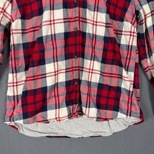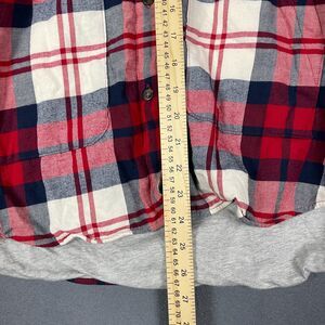 Eddie Bauer Shirt Jacket Women's XL Red Ivory Plaid Hi-Low Button Front Hooded