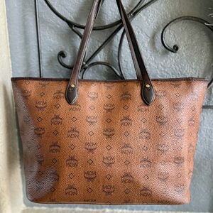 MCM Visetos Dog Bone Striped Shopper Tote Bag Cognac Brown & Blue