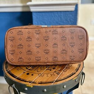 Sophisticated tote, finely crafted of visetos coated canvas in brown with classic MCM monogram print. Vibrant pop of color with a vertical stripe detail in shades of gray, orange, and blue.