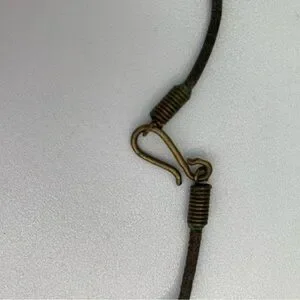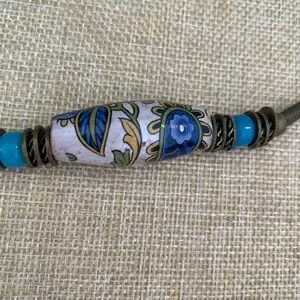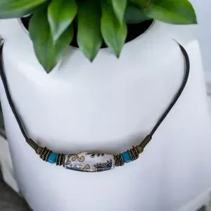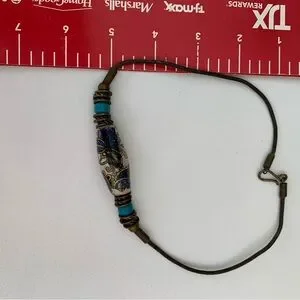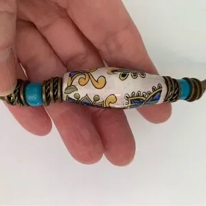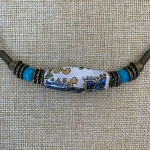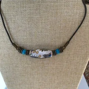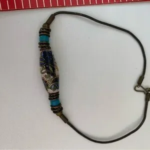 This stunning necklace showcases a captivating blue and gold color scheme, highlighted by an oval-shaped ceramic focal bead. The vibrant blue beads and intricate designs add a touch of throwback charm, making it a standout piece in any jewelry collection. Surfer, hippie, ceramic bead, leather cord. Vintage condition.