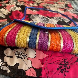 Vibrant woven clutch with multicolor stripes. Perfect for adding a pop of color to any outfit, or to take along on a tropical vacation
