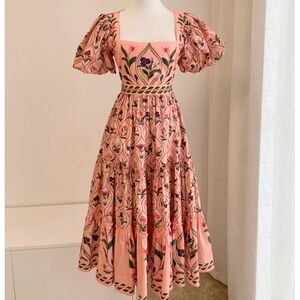 Agua by Agua Bendita showcases its sophisticated and timeless style with the Alga Pacifico dress. In a fluid midi design, this cotton poplin piece is enhanced by a playful placement print against a pink background.
