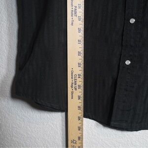 This is a men's Western-style button-up shirt from the brand Ely Cattleman in size L with a black striped pattern. It features short sleeves and pearl snap closures for a classic Western look. The shirt is designed with a theme that evokes a rugged, cowboy-inspired aesthetic, making it a stylish and versatile addition to a casual wardrobe.