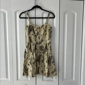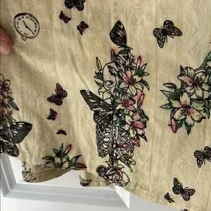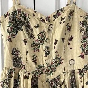 Charming skull and floral print Hell Bunny Pinup style sundress with clocks, skulls, flowers. Fitted sweet heart neckline bodice with decorative buttons and flared skirt. Perfect for warm days. Has back zipper with clasps and adjustable straps. The dress also has pockets. Size small. From Hot Topic in the late 2000s