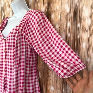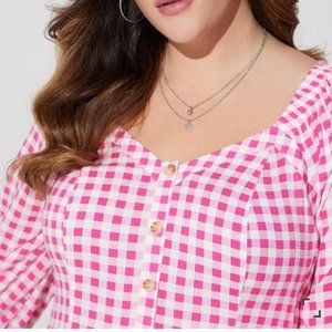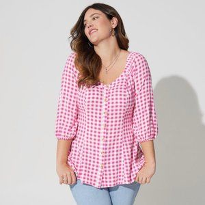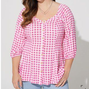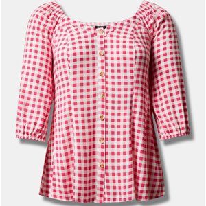 Torrid Fit & Flare Rayon Slub Button Up 3/4 Sleeve Pink Gingham Top