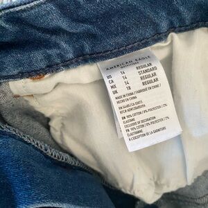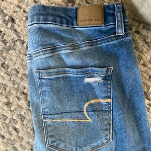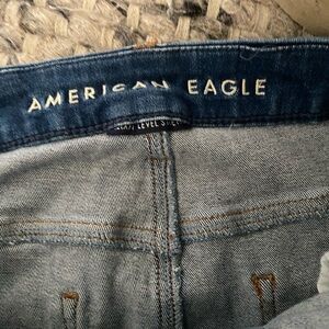 AMERICAN EAGLE Skinny Size 14. Stylish and comfortable distressed blue jeans perfect for any casual outing. These jeans offer a trendy look with their unique design. EUC. Inseam is 28”. Smoke free home.