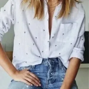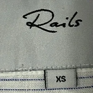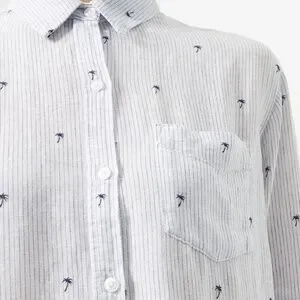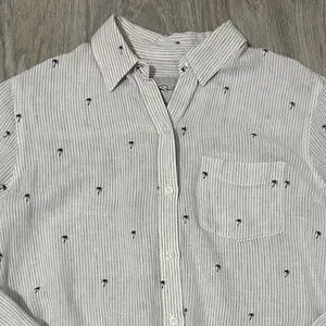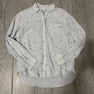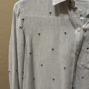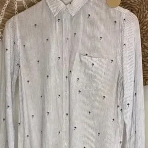 Women's Rails, Charlie Mini Palms Royal Blue Striped button down top. Beautiful, soft linen/cotton blend fabric. Lightweight. Light blue thin vertical pin stripes, tiny blue embroidered mini palm trees. Pocket on front. Long sleeves. Great looking on - great for spring and summer. Worn only a few times, in nice condition. SIZE - XS