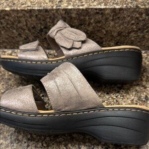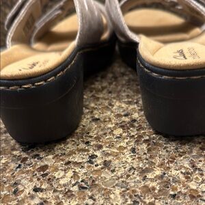 Step into comfort with Clarks women's sandals. Slip on, velcro adjustable straps. 2" heel. Very comfortable. Worn only once or twice (can no longer wear heels). No signs of wear. Smoke free home.