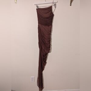 Nookie Sz Medium Brown Mecca Ruched Mesh One Shoulder Slit Sleeveless Gown sexy