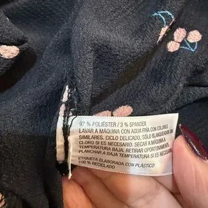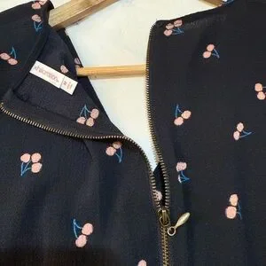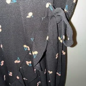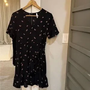 This charming dress by Xhilaration features a playful black and pink cherry pattern, perfect for casual or work settings. The dress has short ruffled sleeves, with a ruffled, tiered skirt that adds a touch of femininity.