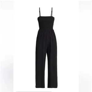 Easy-going wide-leg jumpsuit with cool waist pockets and a stretch smocked bodice.