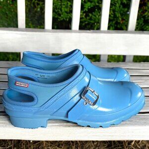Baby Blue Hunter Clogs size 9 in Pre-Loved Condition. The soles and inside of shoes are in Great Clean Condition. There is a little discoloration on the sole from use but there is no wear. The insoles have been washed and sanitized. The upper is clean and free of holes, rips, cuts, scuffing and marks.