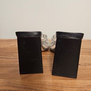 A slip-on silhouette featuring embellished vinyl and a square-shaped toe.
