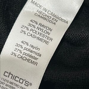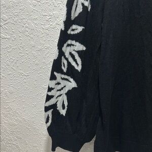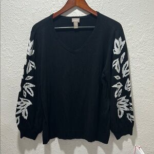 Chico's black sweater featuring a white leaf pattern on the sleeves. Perfect for a stylish look. Size 3