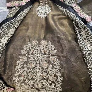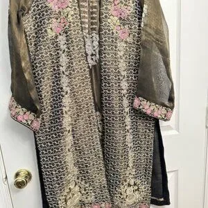 Worn Once Custom Stitched Trouser,Shirt & dupatta. Shirt has all over embroidery design on the front. Shirt is stitched jacket style with front panels