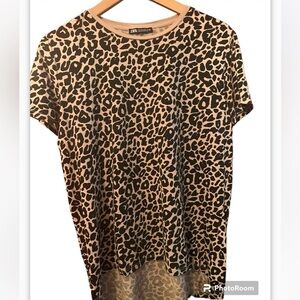 Zara Leopard Print Boxy Fit Short Sleeve Sz M Tee, Black Brown Beige
