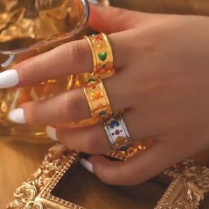 Soo Chic! Fabulous 18k Gold Plated Stainless Steel Wide Band Ring with Multi Colored Enamel Hearts! Soo Pretty & Unique