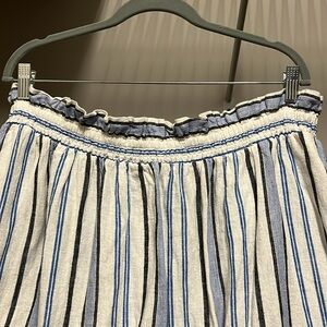 This skirt is, EUC only worn a few times. It measures 32 inches long and has an 17 inch waist. And the waist is elastic so it has some give on these measurements. It has two front side pockets. It's 55% linen, 45% rayon and is machine wash, dryer, and iron safe.