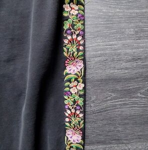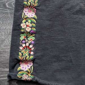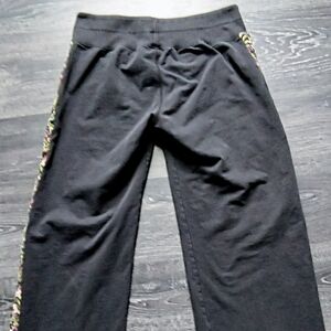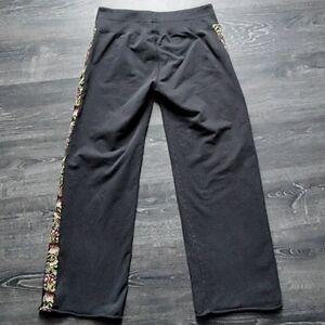 Lucky Brand knitwear embroidered trim sweatpants. Black joggers with multicolor floral embroidery side trim. Drawstring waistband. Raw edge hems. 100% cotton size L. Flat waist measurement: 15.5". Outseam: 39.5" Inseam: 29.5". Last picture shows mystery staining that could not be removed.