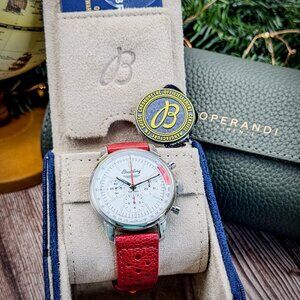 Offered by NoVA Watch Supply of Fairfax, VA: A pre-owned, but unworn Breitling Top Time Ford Thunderbird Chronograph 41mm REF. AB01766A1A1X1. The Breitling Top Time Classic Cars Squad pays homage to classic sports cars from the 1960s; this specific example draws inspiration from the 1954 unveiling of the Ford Thunderbird, the car that combined luxurious design with also being fun to drive. This simple yet sophisticated piece features a 41-millimetre stainless-steel case with a detail rich stunning white dial featuring a speed-measuring tachymeter scale, “squircle” subdials with vibrant contrasting hands providing a vintage dashboard feel, and the classic Ford Thunderbird logo on both the dial and the exhibition caseback. All that presented on a true-to-era red perforated leather strap, truly a special piece and a must have for any Breitling collector, or anyone who can appreciate this special era in time. This piece comes with the following: