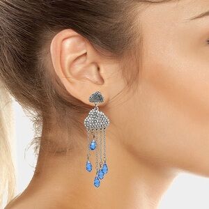 Spring showers bring May flowers with these charming chandelier earrings. Featuring puffy clouds paired with dangling chain fringe and blue faceted bead rain drops. Adorned with coordinating sparky stones.