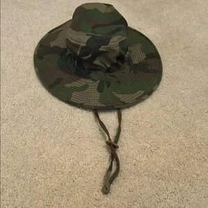 Stylish camouflage boonie hat with adjustable chin strap. Perfect for outdoor adventures.