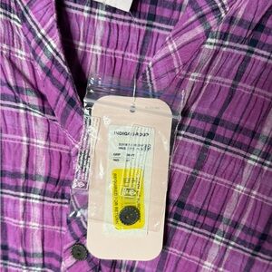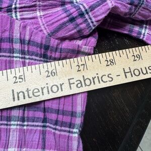 This New relaxed-fit blouse by Allison Daley features a stylish plaid pattern in shades of purple/pink. It is a light cool fabric that does not need to be ironed. The top is designed with a mandarin collar and long sleeves, offering a comfortable and chic look for any casual occasion.