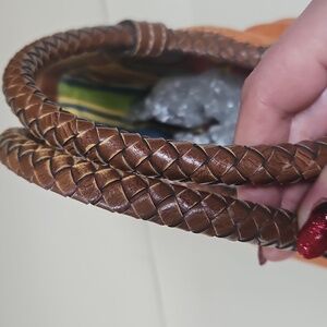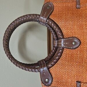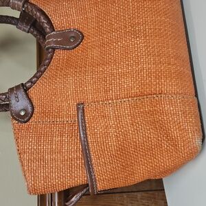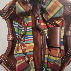 Gently used in great condition! The corners have some minor wear shown in the video. The inside middle zip pocket is about half the size of the bag itself. Outside side have large slip pockets. Inside has two slip pockets, a zipper pocket and the middle zipper pocket. There are also D rings so a strap can be added and the lining has a couple of spots.