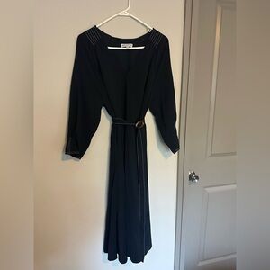 Cute dress, has a side zipper and a belt. One of the belt strings broke (shown in photos). Has a button at the neck of the dress.