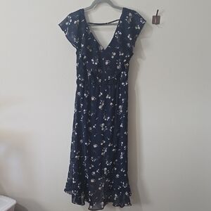 Elegant navy dress with a floral pattern, perfect for any occasion. The flowing design adds a touch of sophistication. Style is a faux wrap and slightly longer in the back. Lined until about knee length.