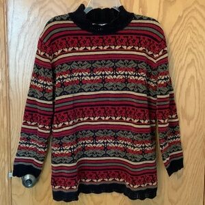 Segue - Vintage Velour Sweater With Lace Collar, Cuffs & Hem. Beautifully soft velour material, including the lace portions. Striped along with abstract designs. Black, red, tan, blue and olive green. Same design front & back. The collar is like a loose mock turtleneck. See photos.