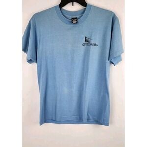 This vintage men's t-shirt features a classic fit and is crafted from blue cotton material with a crew neck and short sleeves. The shirt showcases an animal print design of a moose, adding a nature-inspired theme to the piece. The single stitch detailing and retro "Friends of Quetico Park" logo give it a nostalgic 80s and 90s vibe, making it a unique and collectible addition to any wardrobe.