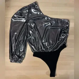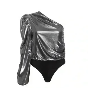 Bring some serious shine to your next party or evening soiree with this silver bodysuit. The Bianca bodysuit from MISA is cut from gorgeous metallic silver in a one-shoulder silhouette. The bodice drapes effortlessly, while the long blouson sleeve adds one last touch of detail. Pair with your favorite high rise denim for instant chic.