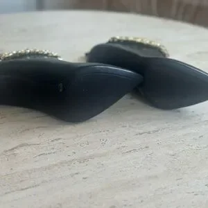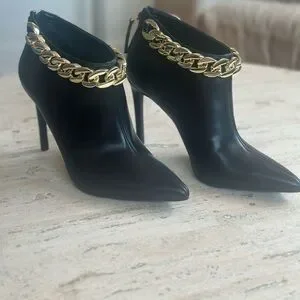 New never worn stylish ankle bootie! Vegan leather with Chunky Gold chain adorning the top! Slip free sole and 4.5 inch heel. Gorgeous