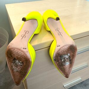 Jessica Simpson PRIZMA neon yellow size 6 heels all man-made material with a faux Paten leather appearance . has some scuffs to the exterior which can possibly be removed. the interior lining on the right shoe has a tear as well as the left interior lining going towards the toe has a small tear in fair to good condition overall